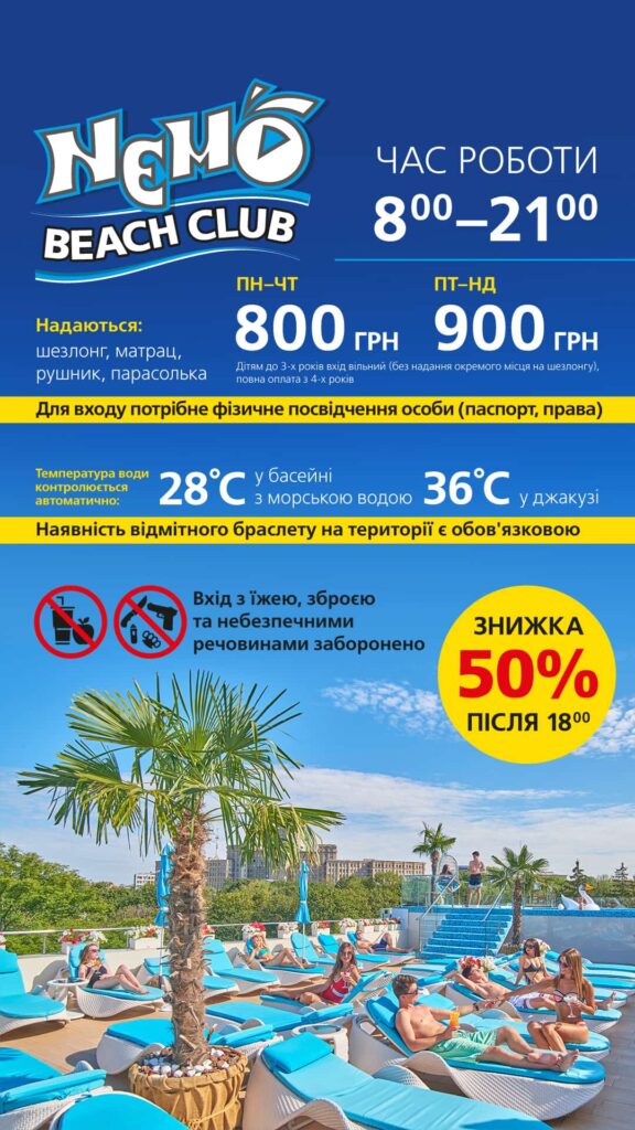 Дітям до 5 років вхід безкоштовно без надання шезлонгу.