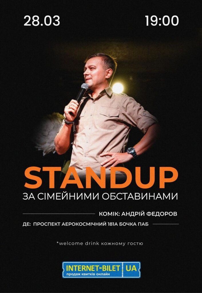Суботній вечір можна завершити стендапом у пабі. Сольний виступ Андрія Федорова — варіант для тих, хто хоче простого формату: бар, жива аудиторія, гумор і легкий настрій без зайвого пафосу.