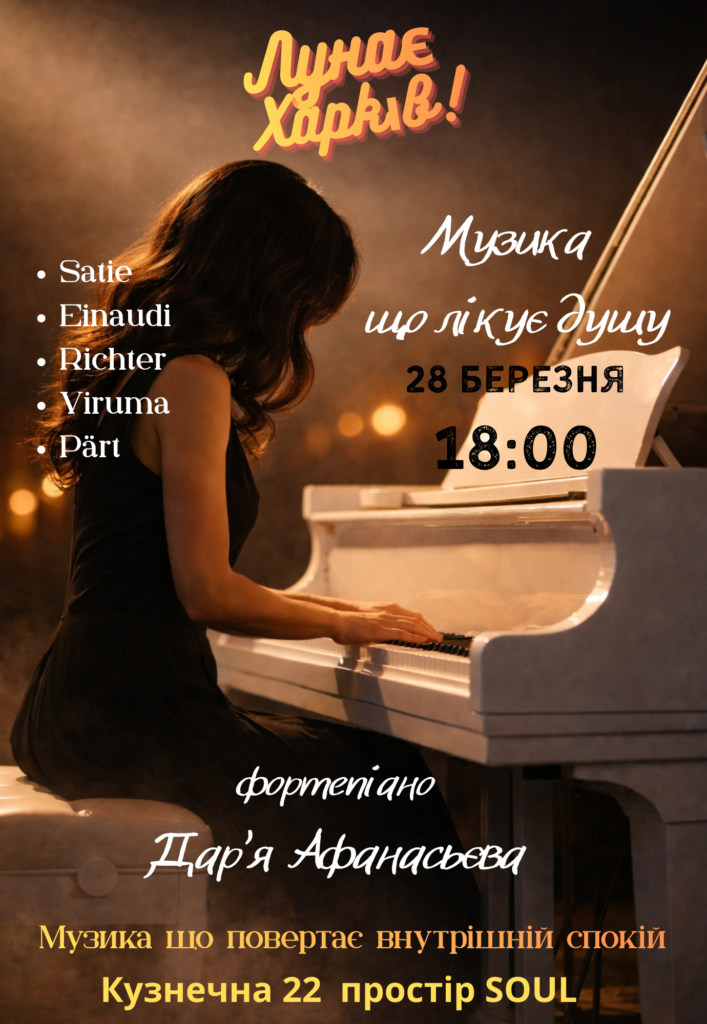 Камерний вечір у просторі SOUL об’єднає твори Ludovico Einaudi, Max Richter, Yiruma, Arvo Pärt та Erik Satie. Це подія для тих, хто хоче відпочити від шуму, сповільнитися та провести годину в атмосфері тиші, спокою й делікатної живої музики.
