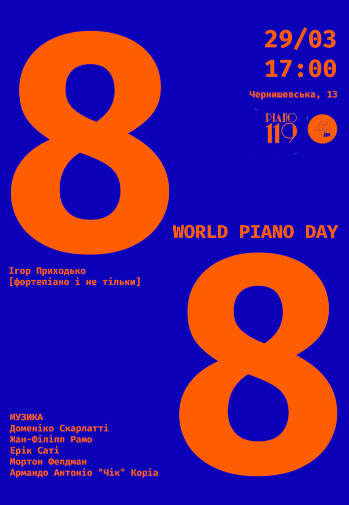 У Art-Area ДК відзначать Piano Day — день, присвячений фортепіано та його 88 клавішам. У програмі — музика Скарлатті, Рамо, Саті, Мортона Фелдмана та Чіка Коріа. Подія підійде тим, хто цінує камерні концерти й хоче завершити вихідні інтелігентно та спокійно.